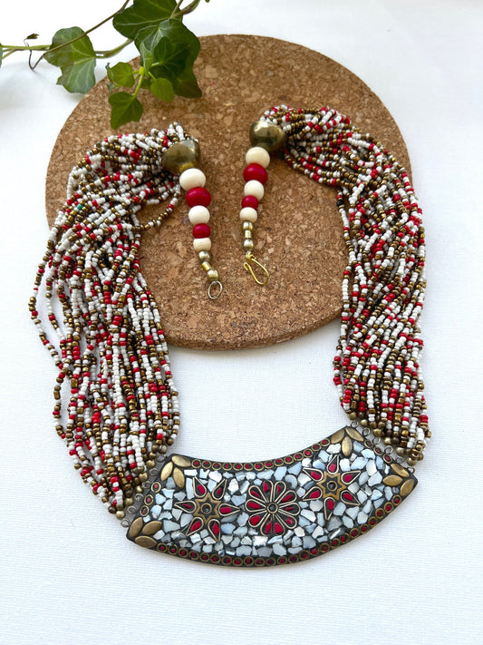 Gold Brass Braided Beaded Statement Necklace – Handcrafted Bold Boho Jewelry